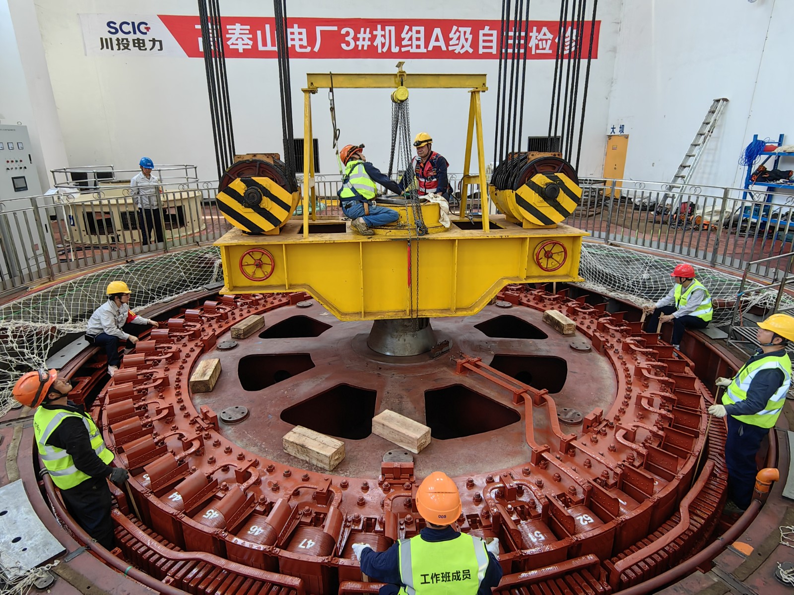 由于轉(zhuǎn)子與定子之間的間隙只有12毫米,要把這兩個(gè)“大家伙”精準(zhǔn)送回機(jī)坑指定位置并安裝好,難度系數(shù)非常高。川投電力高度重視,上下聯(lián)動(dòng),周密部署,全鏈條壓實(shí)安全生產(chǎn)責(zé)任,確保轉(zhuǎn)子回裝工作萬(wàn)無(wú)一失。