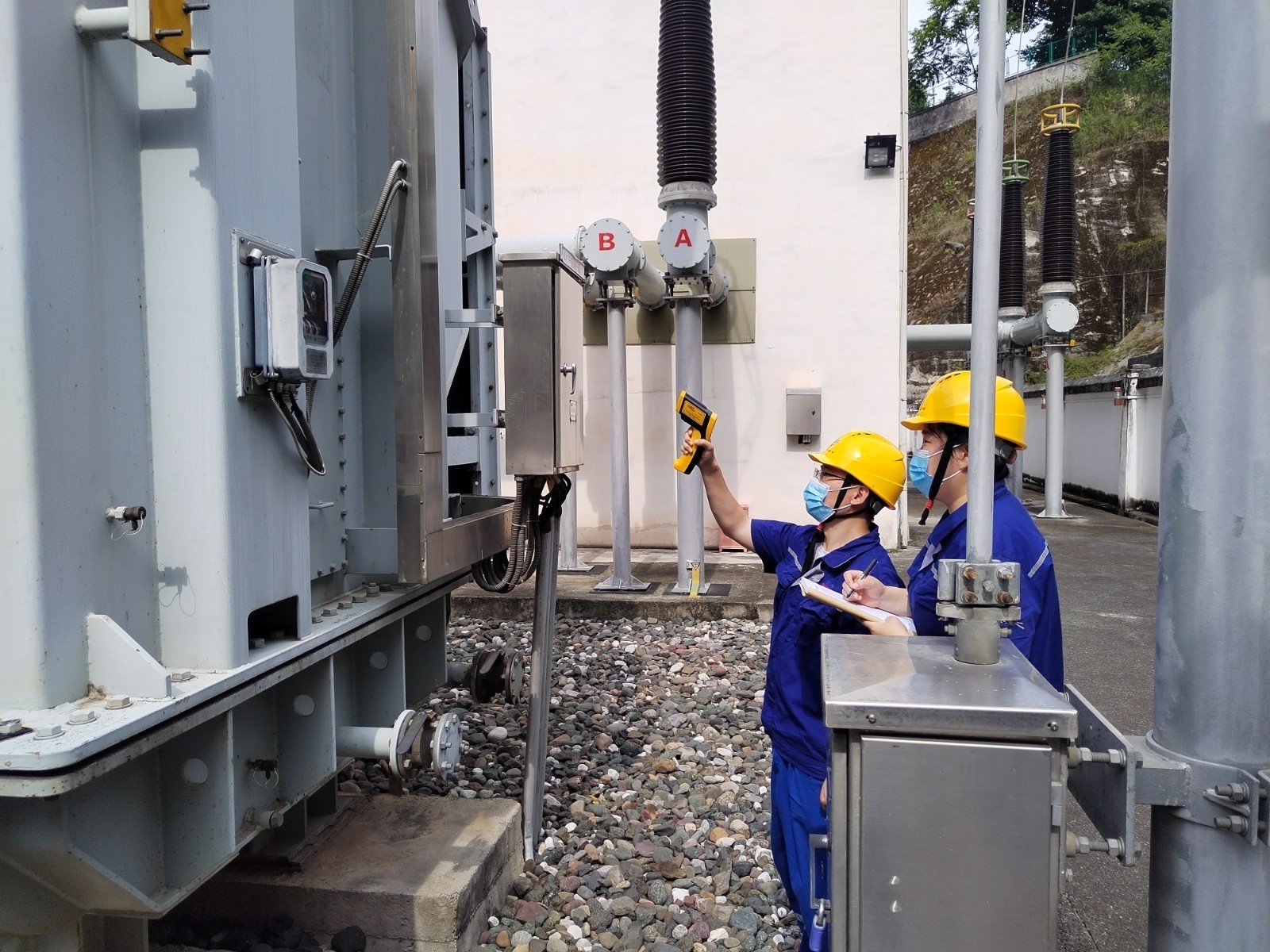 受涼山州氣候影響,較大晝夜溫差給玉田電站設(shè)備穩(wěn)定運(yùn)行增添雙重負(fù)荷考驗(yàn)。“寧做無用功,不留一隱患?!比胂囊詠?,廠長孫萬慶始終堅(jiān)持每日帶領(lǐng)維護(hù)人員在中午高溫時段到廠區(qū),大壩等對電力設(shè)備設(shè)施開展帶電檢測和紅外測溫。7月11日午時,1號主變C相低壓側(cè)導(dǎo)管突然出現(xiàn)輕微滲油現(xiàn)象,維護(hù)人員頭頂烈日,“汗”衛(wèi)堅(jiān)守在1號主變前,精心監(jiān)視滲油狀況,研討避峰消缺方案,中控室監(jiān)控人員加強(qiáng)遠(yuǎn)方監(jiān)視,奮戰(zhàn)9小時,奮力保供電。